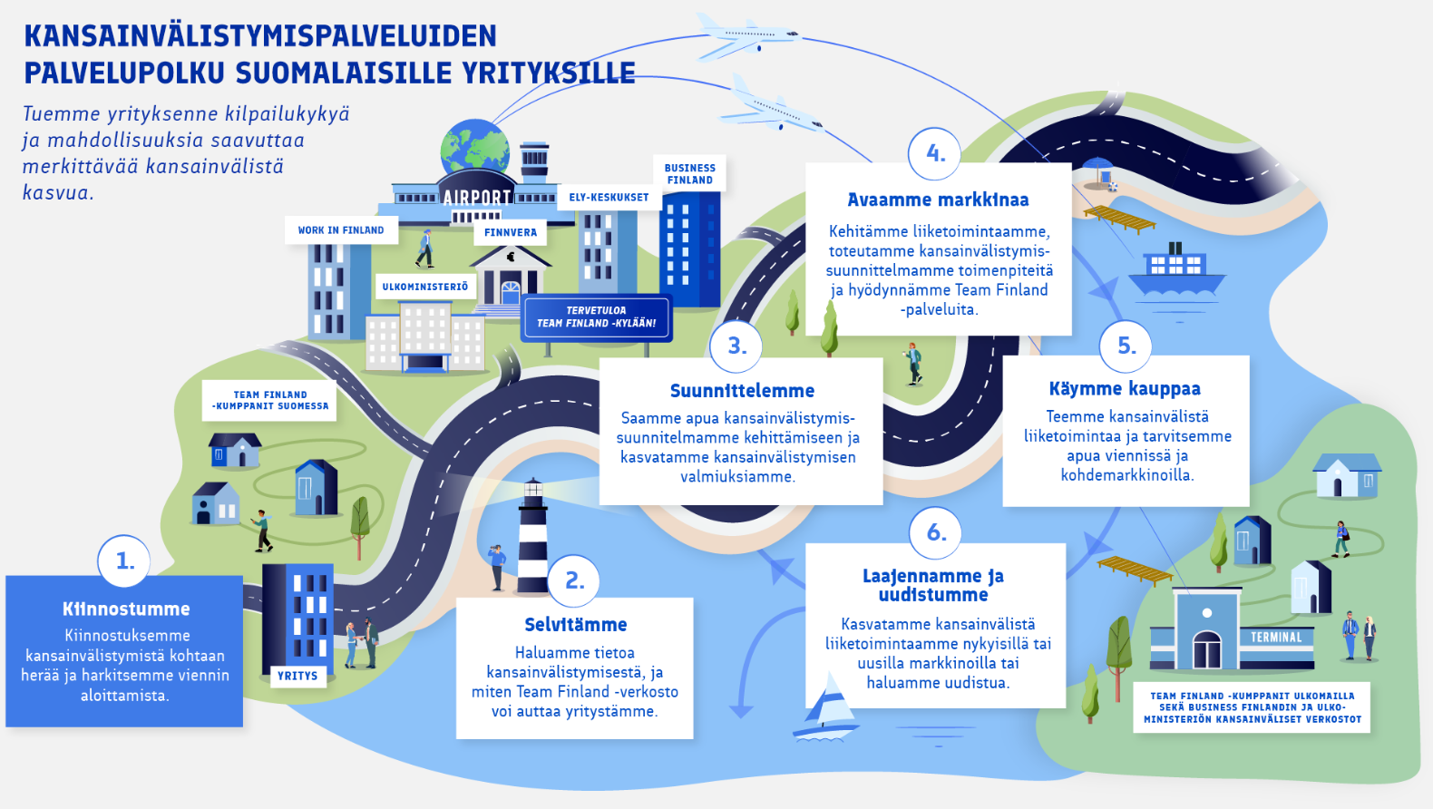 Team Finland-verkoston rooli on tukea yrityksen kasvua ja kilpailukykyä elinkaaren eri vaiheissa.