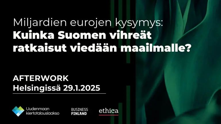 Miljardien eurojen mahdollisuudet odottavat maailmalla. Erityisesti kiertotalouden ratkaisuissa piilee valtava vienti- ja kasvupotentiaali. Business Finland, Ethica Helsingin seudun kauppakamari ja Uudenmaan kiertotalouslaakso kutsuvat etenkin yrityksiä tutustumaan maailman markkinatilanteeseen ja etsimään kasvua afterworkin merkeissä 29.1. klo 15–18.