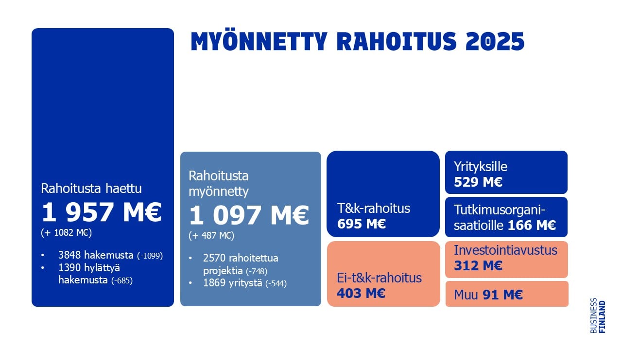 Business Finlandin vuonna 2025 myöntämä rahoitus oli 1 097 miljoonaa euroa. Myönnetyn rahoituksen määrää kasvatti erityisesti uusi investointiavustus suurille puhtaan siirtymän investoinneille, jota myönnettiin 312 miljoonaa euroa.