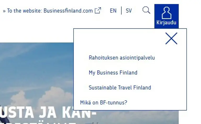 'Kirjaudu'-kuvaketta klikkaamalla löydät linkit rahoituksen asiointipalveluun, My Business Finland- ja Sustainable Travel Finland -palveluihin sekä BF-tunnuksen (BF-ID) luomiseen.