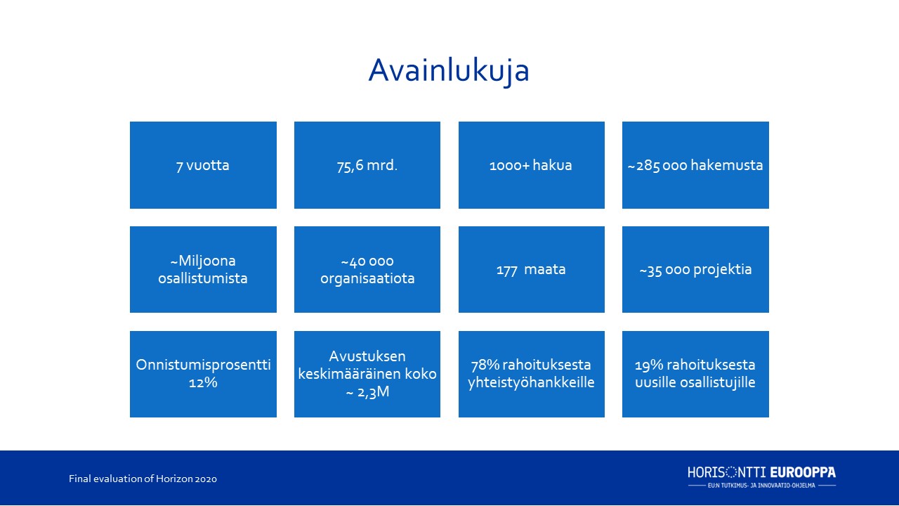 Horisontti 2020 -ohjelman loppuarviointi ja käynnissä oleva nykyisen Horisontti Eurooppa -ohjelman puoliväliarviointi ovat työkaluja, joita hyödynnetään seuraavan ohjelman valmistelussa. EU:n kymmenes puiteohjelma käynnistyy vuonna 2028.