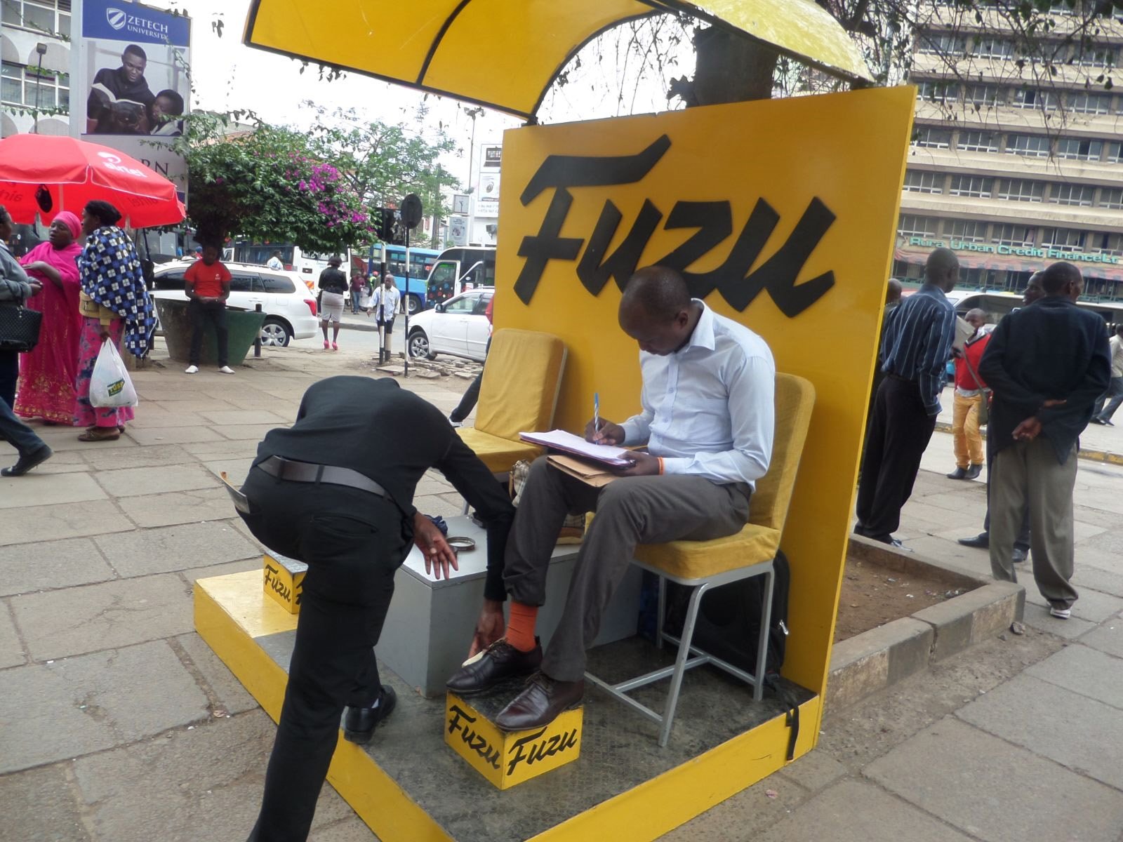 Fuzu launched in Kenya 2015 – people stopped by to get their shoes polished and register as Fuzu users in the process.