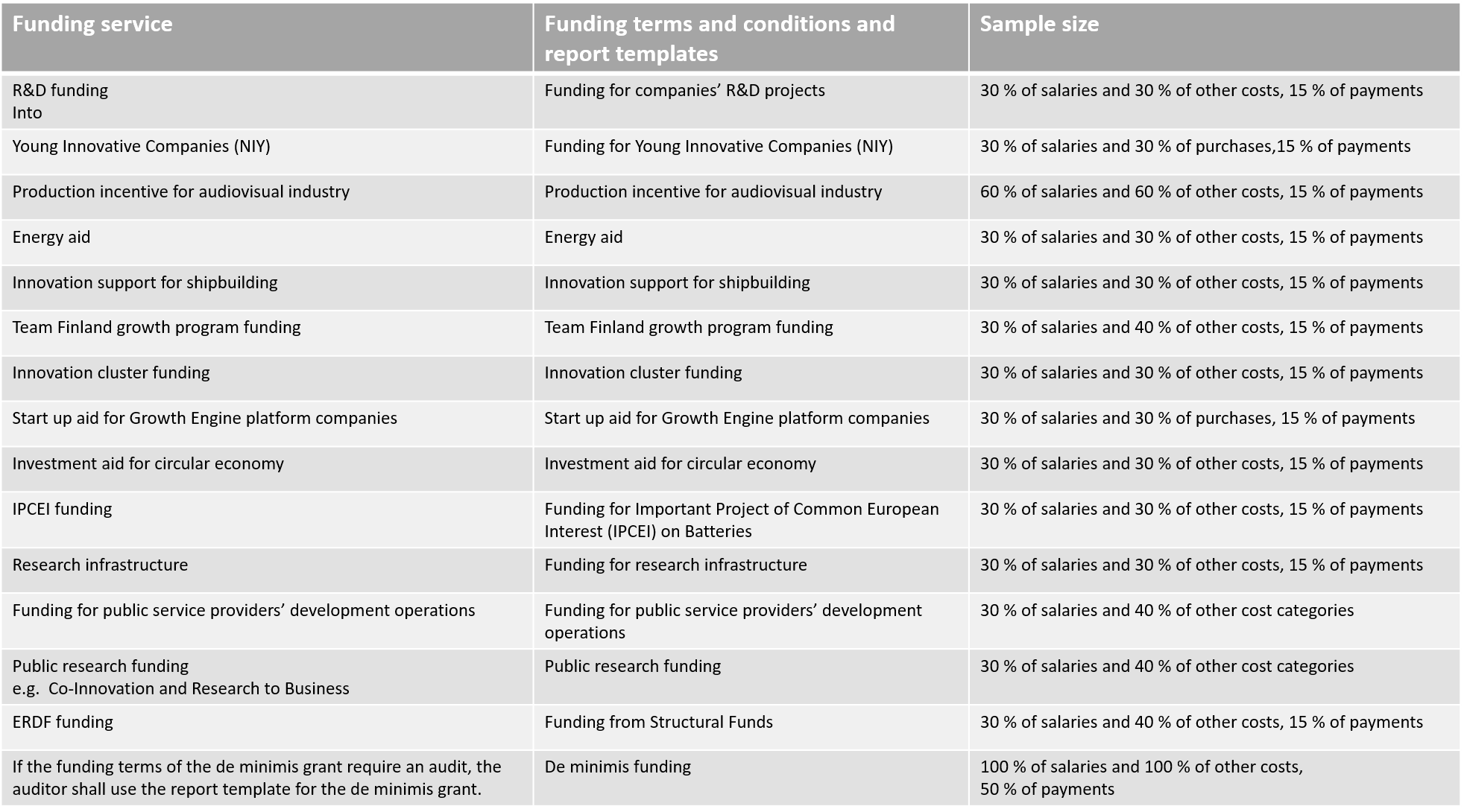 The auditor’s report templates specify the sampling sizes to be used in audits. For example, in the case of de minimis funding, 100% of purchased services must be audited and ensured that they do not include purchases other than expert services. If the purchased services include such ineligible purchases, state their costs in the report to allow Business Finland to deduct them from the funding.