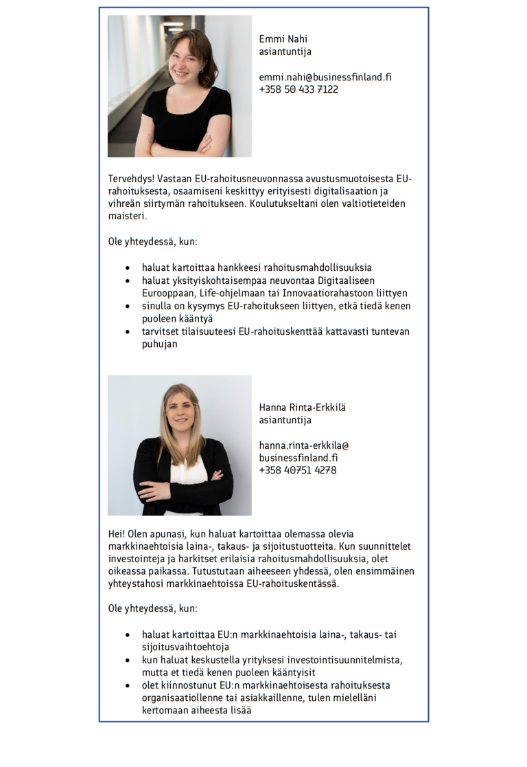 EU-rahoitusmahdollisuuksien kartoittaminen kannattaa aloittaa verkkosivuiltamme. Sivut on rakennettu niin, että rahoitusinstrumentit ovat mahdollisimman vertailtavassa muodossa. Lisäksi tiedotamme ajankohtaisista asioista ja julkaisemme esimerkiksi menestystarinoita.