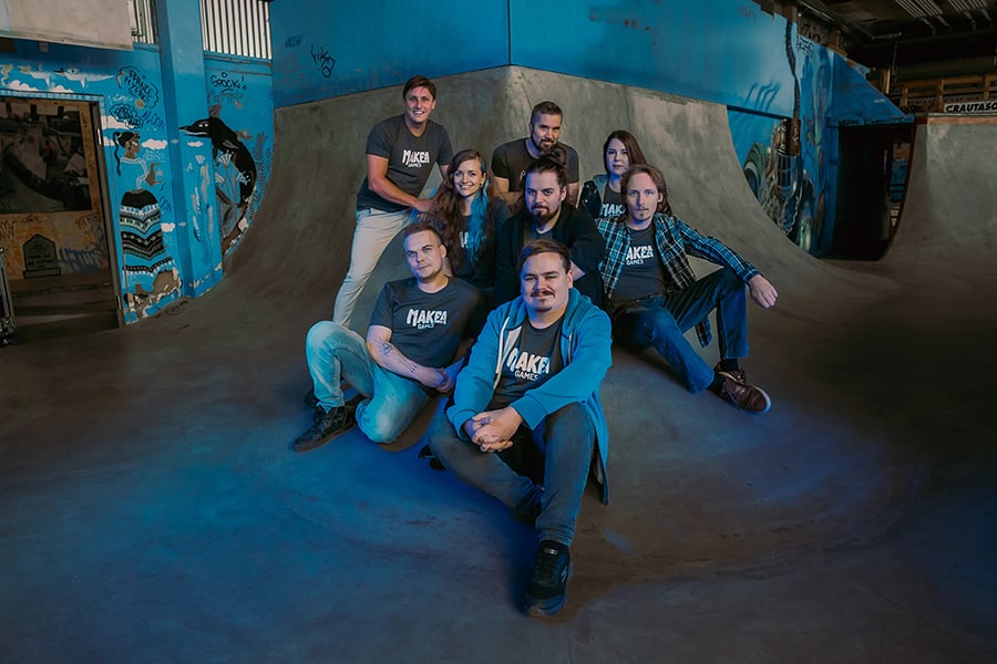 Makea Games -tiimi 2022. Ylärivissä vasemmalta Suman Rath (Founder, Chair of the Board), Teemu Vilén (Chief Operating Officer), Eszter Puzsik (3D Artist). Keskirivissä Bea Saikko (Founder, Art Director), Tony Kihlberg (Founder, Lead Artist), Ville Valtiala (Founder, Chief Technology Officer). Eturivissä Severi Suominen (Founder, Lead Programmer), Tomi Toikka (Founder, Creative Director & Chief Executive Officer).