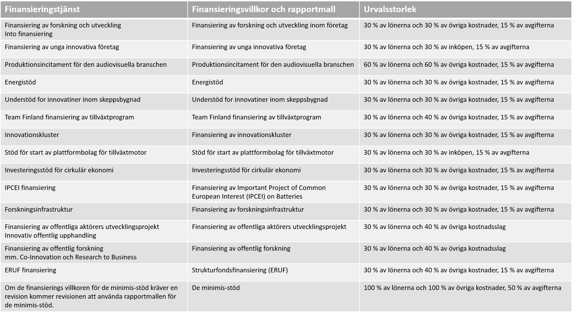 I revisionsrapportmallen bestäms omfattningen av det urval som granskningen omfattar. Till exempel vid de minimis-finansiering ska 100 procent av de köpta tjänsterna granskas och det ska säkerställas att de köpta tjänsterna inte innehåller annat än experttjänster. Om sådana anskaffningar som inte hör till ingår i de köpta tjänsterna, nämn kostnadsbeloppet så att Business Finland får information om den andel som ska dras av.